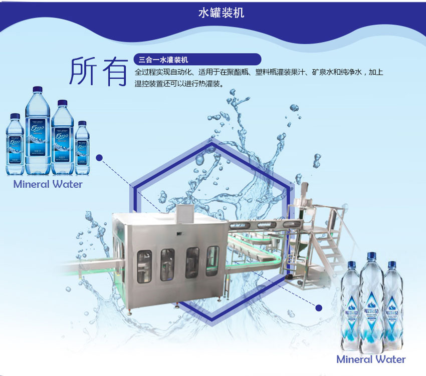 全過程實現自動化、適用于在聚酯瓶、塑料瓶灌裝果汁、礦泉水和純凈水,加上溫控裝置還可以進行熱灌裝。