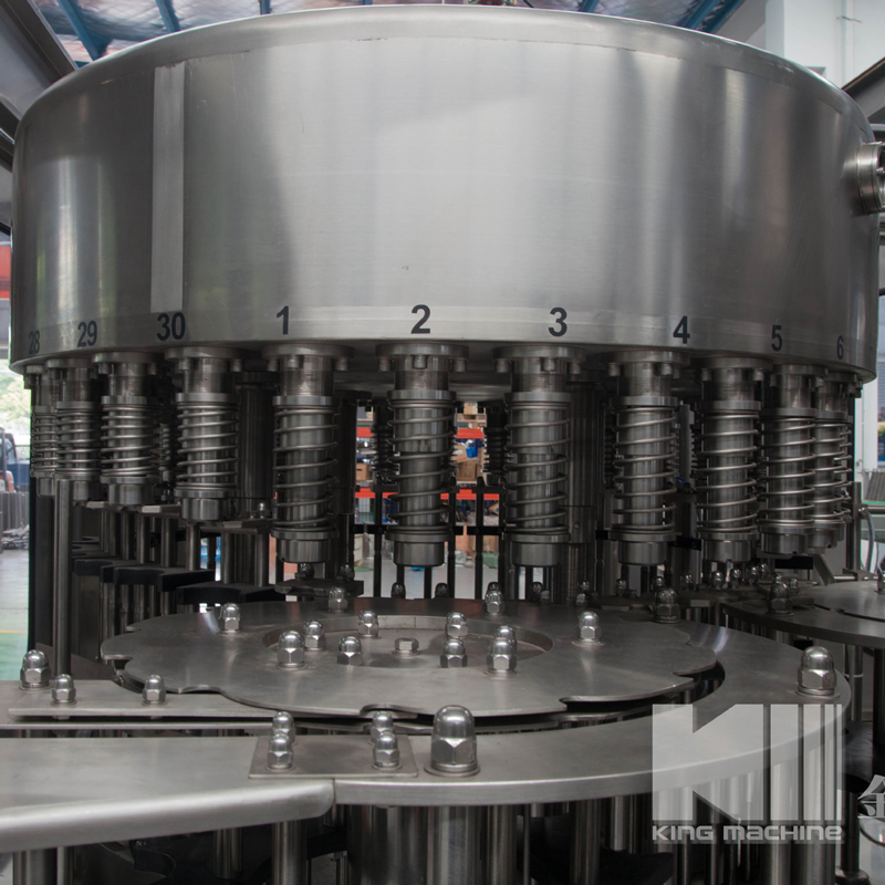 飲用水灌裝機集沖洗、灌裝、旋蓋于一體,全過程自動化運行,主要適用礦泉水、純凈水等不含氣飲料的沖瓶、灌裝、封口連續(xù)作業(yè)。本機大部分電器系統(tǒng)零件均采用國外優(yōu)良產(chǎn)品,所有與液料接觸的地方均采用優(yōu)質(zhì)的不銹鋼材料制作,主關(guān)鍵部件采用數(shù)控機床精密加工, 整機光電檢測各部件的運行狀況,無瓶不灌裝,無瓶不送蓋,自動化程度高,操作簡易,具有耐磨、穩(wěn)定、故障率低等特點,產(chǎn)品質(zhì)量處于行業(yè)前列,是新老飲料投資者的選擇。